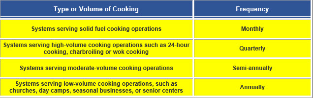 NFPA-96 section 11.6. 2 states (NFPA Kitchen Hood Cleaning Requirements): “Hoods, grease removal devices, fans, ducts, and other appurtenances shall be cleaned to remove combustible contaminants prior to surfaces becoming heavily contaminated with grease or oily sludge.” It goes on to outline the frequency of inspection and cleaning based on cooking volume (see outline below).
